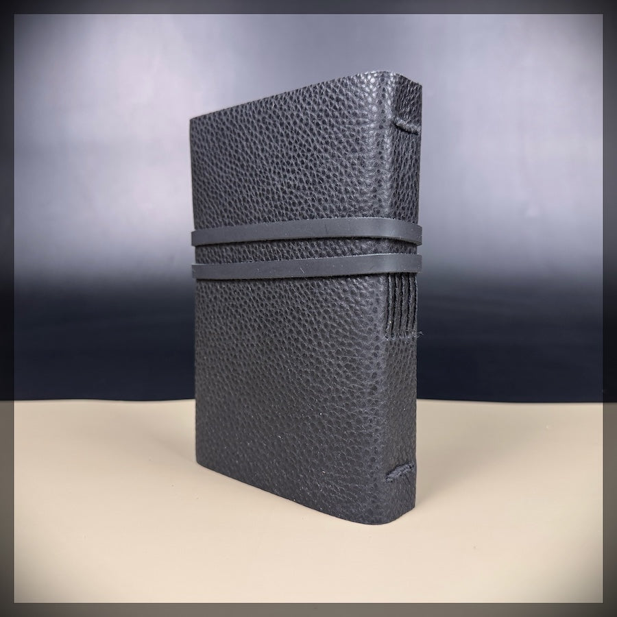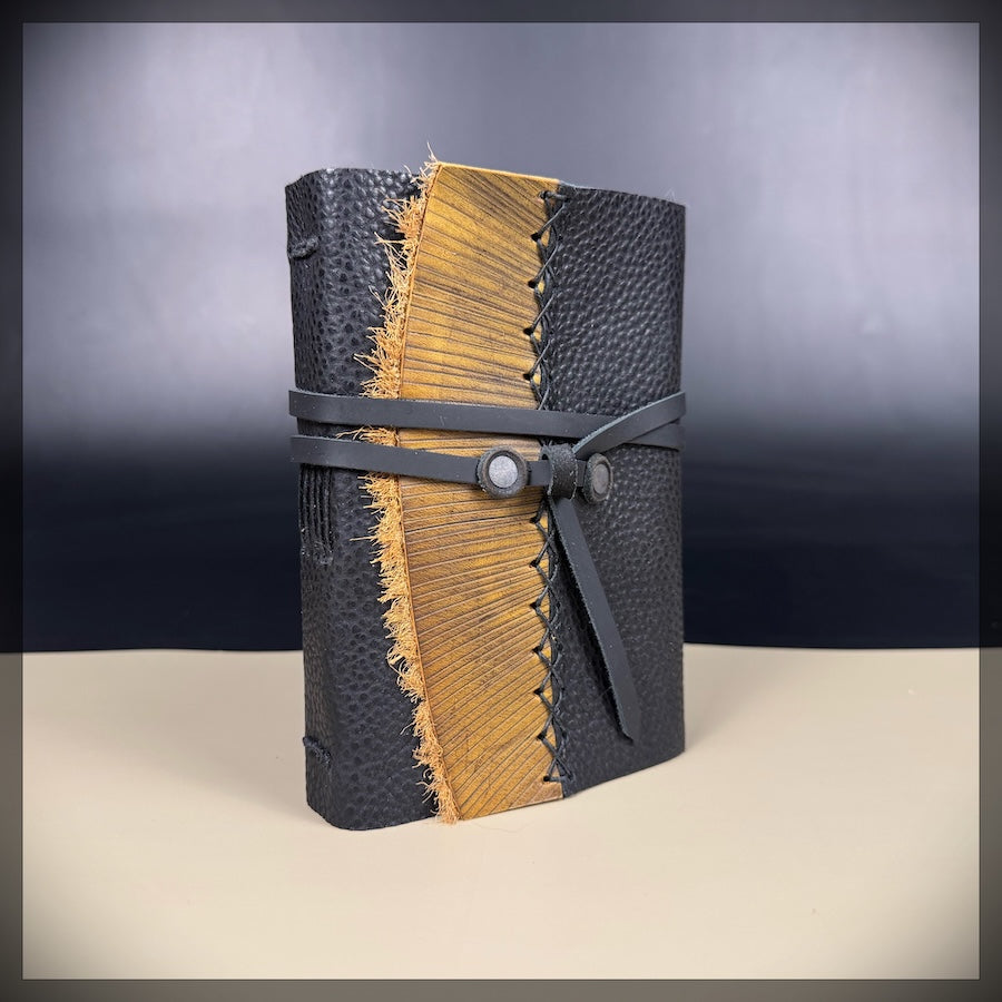 This travel-size journal is crafted to go with you, not slow you down. Wrapped in richly textured black leather, it has a bold, grounded presence—strong but supple, unfussy yet full of character. Stitched onto the front cover is a contrasting panel of distressed leather, hand-burned with radiating lines that echo rays of sun or outward movement—an intentional nod to expression, creativity, and stories moving outward from within.
