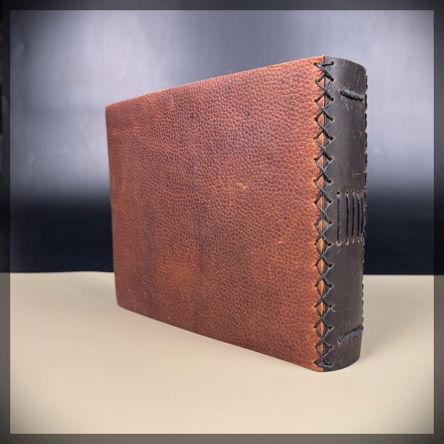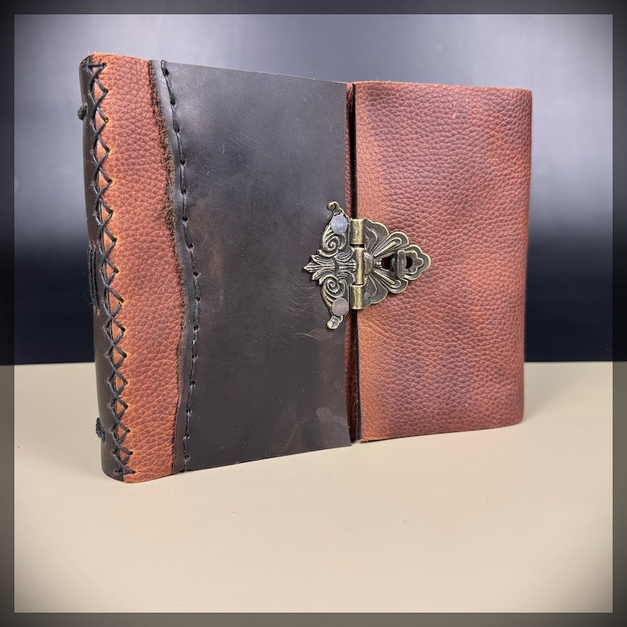Wrapped in richly textured leather with warm brown tones and darker accents, this journal feels grounded, substantial, and totally classic! An antique-style metal clasp keeps your writing protected, while hand-stitched details and natural variations in the leather give Wordsworth a timeless, old-soul presence—like a book that belongs on a desk, beside a favorite pen, waiting patiently for your next line.